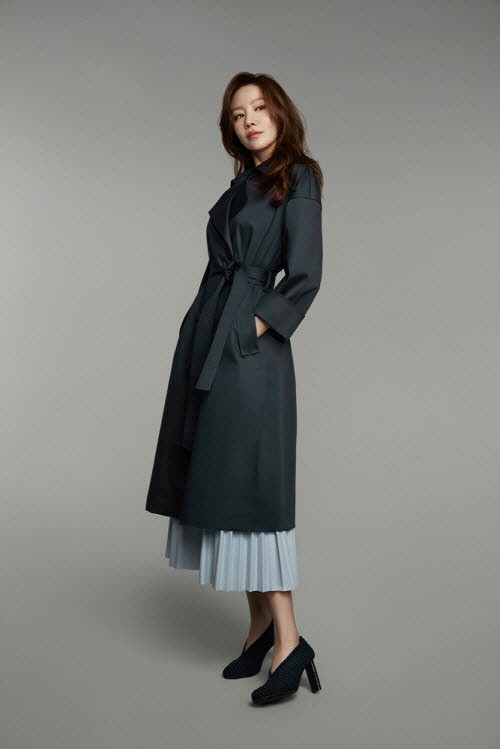 클래식한 네이비 컬러의 트렌치코트를 활용해 페미닌하면서도 모던한 무드를 제안하고 브라운 컬러의 셔츠로 완연한 가을 분위기에 녹아든 모습을 보여주었다.
