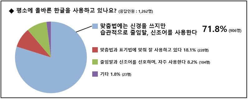 설문조사에서는 평소 ‘올바른 한글을 사용하고 있는가’에 대한 질문에 전체 응답자 중 906명(71.8%)의 학생이 ‘맞춤법에는 신경을 쓰지만 습관적으로 줄임말, 신조어를 사용한다’고 응답했다. 이어 ‘맞춤법과 표기법에 맞춰 잘 사용하고 있다’는 학생들이 228명(18.1%)로 나타났으며 ‘줄임말과 신조어를 선호하며, 자주 사용한다’는 학생도 104명(8.2%)인 것으로 집계됐다.