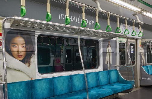 ‘쉬즈미스’ 런웨이 지하철 랩핑 광고는 객실 내 천장과 출입구를 제외한 모든 면을 탑 모델 겸 방송인 한혜진과 함께한 쉬즈미스 올 FW 광고로 랩핑했다.