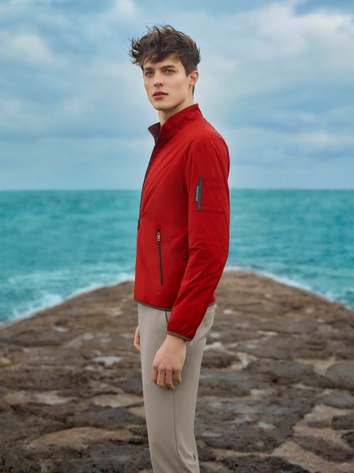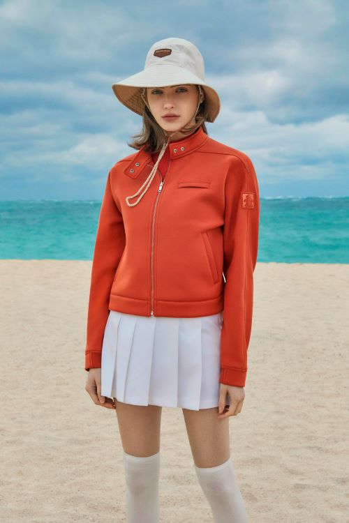 여성용 트랙점퍼는 요즘 트렌드인 라이더형 스타일의 아우터이다. 상큼한 오렌지 컬러, 어깨에 각을 살린 입체적인 패턴은 시크한 분위기를 자아낸다. 직선적인 절개 패턴에 신축성 높은 쿠션지 소재를 사용해 착용 시 형태감이 살아나 체형의 단점이 보완되고 안정감 있는 스타일링 연출이 가능하다. 남성용 플리스 자켓은 레드에 가까운 강렬한 컬러가 눈에 띈다. 좌측 팔 포켓과 전면 양쪽 포켓 테두리의 진회색 디테일로 활동적인 느낌을 더했다. 발수 및 사방 스판 기능이 우수한 이태리 플리스 소재를 사용해 고급스러움의 한 끗 차이를 완성한다.