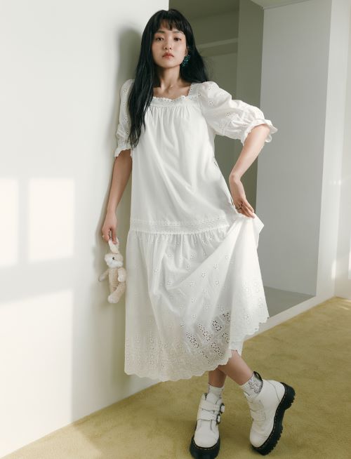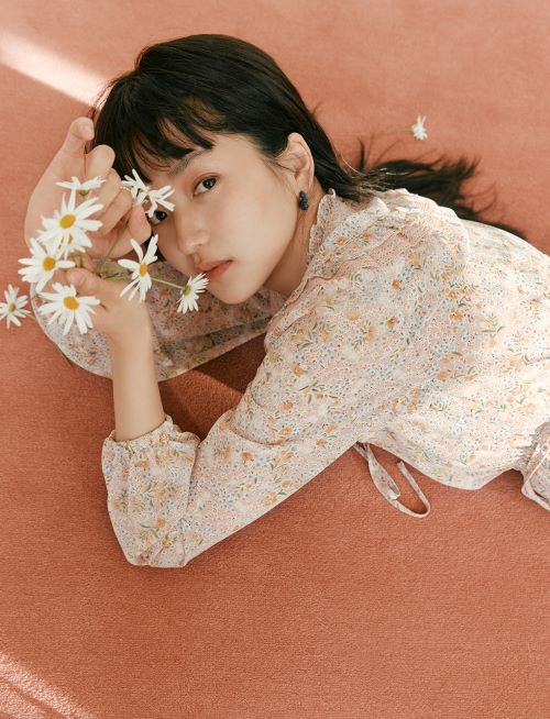 아일렛 디테일이 돋보이는 로맨틱한 화이트 컬러 원피스에는 워커를 믹스 매치하고 톡톡한 컬러의 크롭 기장 니트에 와이드 데님을 매치하여 유니크한 무드를 연출했다. 또 브랜드의 시그니처 아이템인 플라워 패턴 드레스와 함께 로맨틱한 스타일도 다양하게 선보였다.