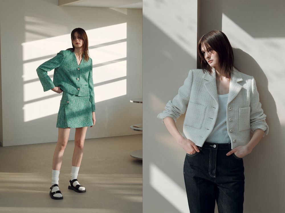 브라이트한 그린 컬러의 자켓 스커트 셋업은 다가올 계절에 대한 희망과 기대를 자아내며 소프트한 컬러의 에센셜 트위드 자켓은 조이그라이슨 특유의 고급스러움과 함께 산뜻한 스프링 무드를 연출하기 좋다.