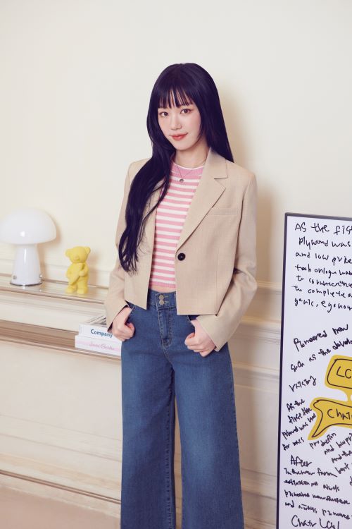또 다른 화보에서는 숏 기장의 베이지 컬러 테일러드 자켓과 핑크 스트라이프 티셔츠, 와이드핏 데님 팬츠를 매치해 트렌디한 캐주얼룩을 선보였다.
