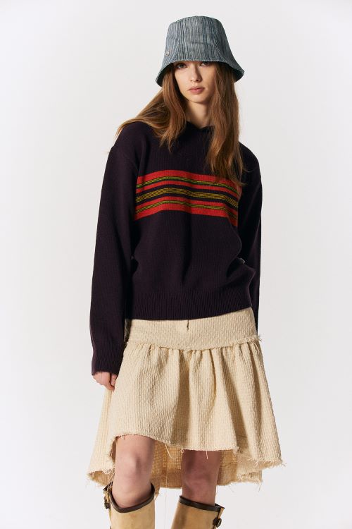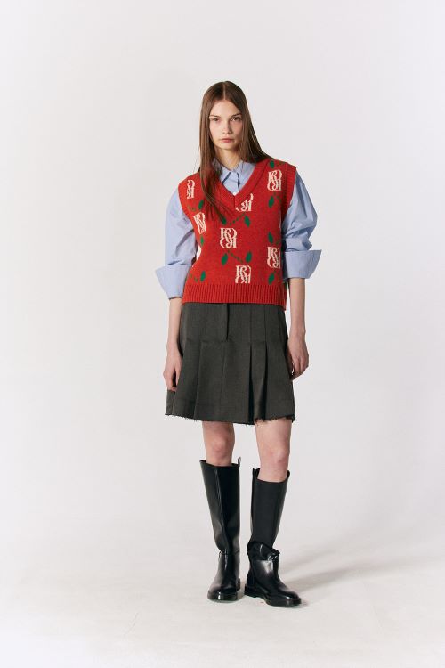 ‘로씨로씨’만의 클래식 심볼을 활용한 자카드 니트 베스트는 램스울, 나일론, 폴리에스터 혼방으로 부드러우면서도 탄력 있는 텍스처가 돋보인다. V넥은 티셔츠나 셔츠 등에 자유롭게 레이어드하기 좋으며 플리츠스커트와 매치해 신학기 프래피 룩을 연출해도 좋다.