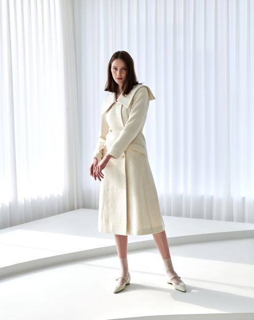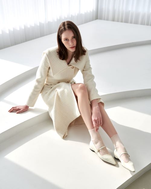 먼저 웨이브 라인 패턴으로 센슈얼함을 더한 메리제인 슈즈가 눈길을 끈다. 올 화이트 투피스 코디의 모델이 시스루 삭스와 매치한 나아라는 브랜드 시그니처 버클로 핏 조절이 가능하다. 7cm의 굽이 슬림한 레그 라인을 연출해주며 곡선의 힐 라인이 세련된 느낌을 주어 격식이 필요한 하객룩, 데이트룩 등 페미닌한 룩에 제격이다.