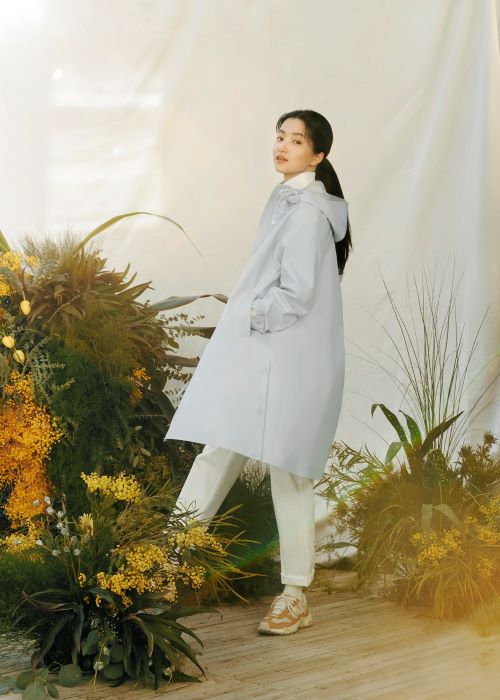 김태리는 크림, 스카이 블루 컬러의 웨더코트와 핑크 컬러 웨더재킷 아이템을 활용하여 봄 내음 물씬 풍기는 스타일링을 완성했다.