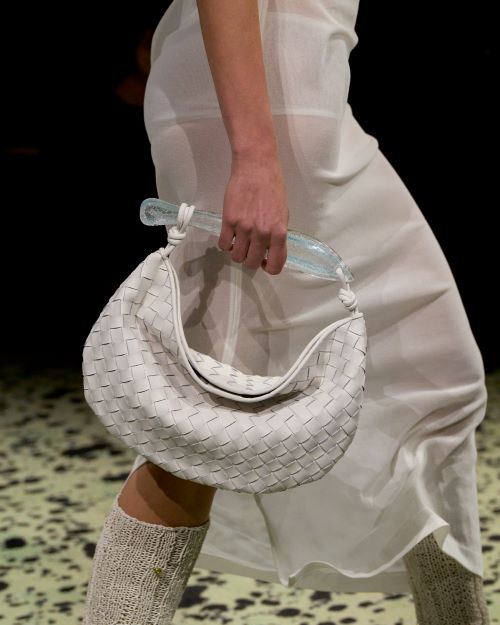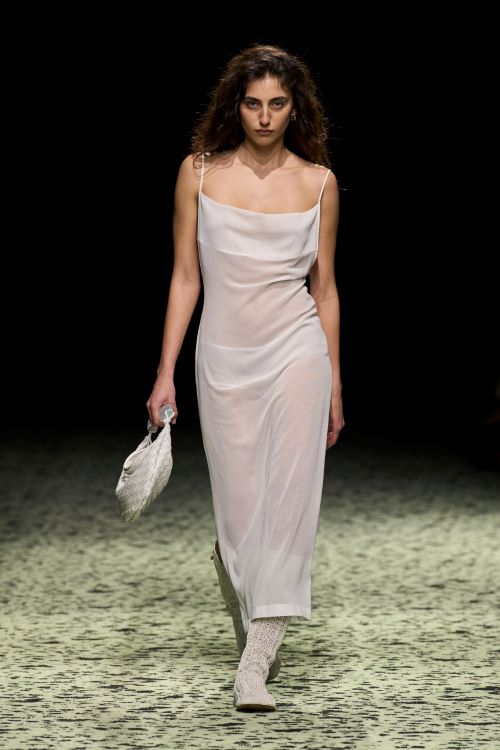 수공 기법은 혁신을 거쳐 ‘보테가 베네타’의 시그니처 실루엣을 재해석하여 깊이 파이고 뼈대를 갖추고, 슬릿 디테일을 더하여 재구성했다. 산드로 보티첼리의 1482년작 ‘프리마베(Primavera)’ 속의 클로리스와 그녀가 변신한 플로라에 영감을 받은 섬세한 실크 자수는 여성의 변신을 표현했다.