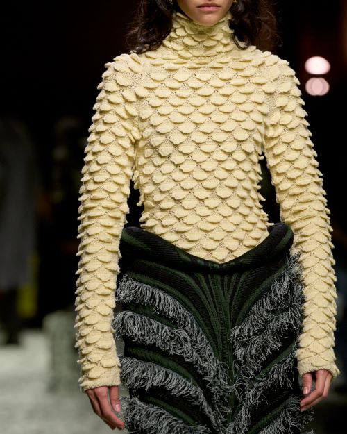 컬렉션과 쇼는 한 사람이 그림이나 문장의 일부를 만들면 그 다음 사람이 이어서 나머지를 완성하는 방식의 연상 기법 중 하나인 ‘우아한 시체(Exquisite corpse)’ 기법처럼 여러 가지를 새롭게 조합하여, 무한한 가능성을 펼쳐낸다. 컷과 수공 기법, 볼륨과 기법이란 코드의 연결, 길게 늘어트린 필 쿠페 자카드를 통해 새로운 창조물을 선보이고 마치 한 몸인 것처럼 움직이는 깃털과 물고기 비늘을 연상시키는 디테일을 이용한 룩과 하우스의 시그니처인 인트레치아토 위빙 기법으로 또 다른 룩과 레더 굿즈의 새로운 구성을 제시했다.
