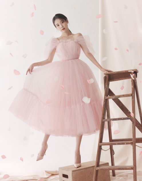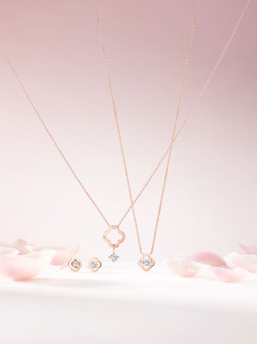 화보는 다가오는 봄의 설렘을 전했다. 흩날리는 꽃잎들 속 아이유가 핑크색 드레스와 매치한 주얼리는 클로비아 컬렉션으로 행운의 상징인 네잎클로버를 모던하게 해석하여 사랑과 행운의 의미를 담았다