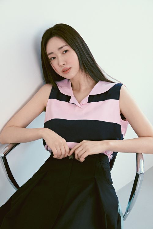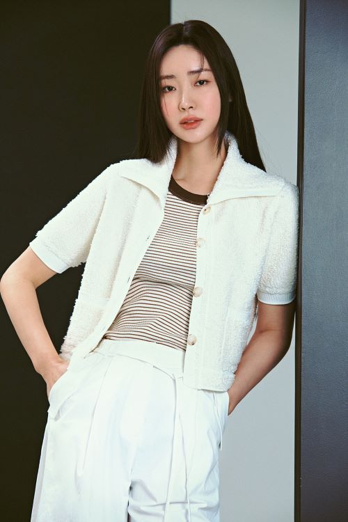 차정원의 하얀 피부와 화사하게 매치되는 핑크 컬러의 코튼 샤기 케이블 풀오버는 오픈 카라와 아웃포켓 디테일이 돋보이며 샤기 케이블 팬츠와 셋업해 스포티한 무드와 사랑스러운 분위기를 동시에 연출할 수 있다. 3버튼의 그리드 체크 크롭 자켓은 그리드한 모노 체크와 금장 단추로 모던하면서도 레트로한 디자인이 특징이며 티셔츠와 데님 위에 또는 단정한 스커트나 원피스 등과 자유롭게 매치하기 좋다.