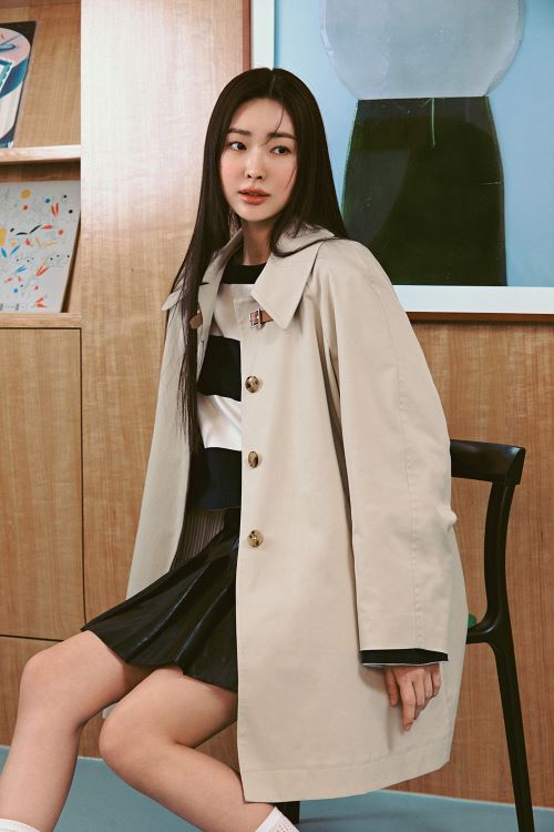 요즘 같은 날씨에 가볍게 걸치기 좋은 하프 트렌치 맥코트는 루즈 핏과 부드럽게 떨어지는 라글란 소매로 여유롭게 착용하기 좋으며 미니멀하게 연출한 히든 단추에 레더 비죠를 달아 포인트를 더했다. 여기에 스트라이프 안감으로 완성도를 높였다. 어떤 이너와도 매치가 쉬운 하프 기장으로 활용도가 높으며 룩북 속 차정원과 같이 페이크 레더 소재의 플리츠 미니스커트와 함께 경쾌한 스타일을 연출해도 좋다.