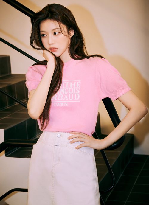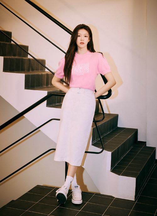 핑크 컬러의 하프 니트와 미디스커트로 우아하고 페미닌한 무드를 연출하는가 하면 캐주얼한 링거 티셔츠에 로우 라이즈 스커트를 매치, 막대 사탕을 활용해 걸리시한 매력까지 자유자재로 선보이며 마리떼 프랑소와 저버 2023년 여름 컬렉션을 완벽하게 소화해냈다.