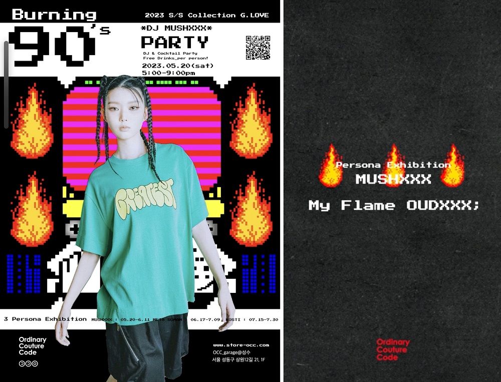 이번 시즌 컬렉션 G.LOVE 페르소나의 첫 번째 전시는 5월 20일부터 6월 11일까지 진행되며 DJ MUSHXXX와 함께하는 ‘My Flame : OUDXXX’로, 향과 음악이 블렌딩된 이색적인 전시를 선보인다. OCC의 아이덴티티 중 하나인 ‘젠더리스’를 키워드로 그녀가 직접 선택한 마이소르 샌달 우드 향의 미스테릭하고 신비로운 향과 직접 믹싱한 믹스 테이프를 통해 에너지의 원천이 되는 향과 음악의 바이브를 느낄 수 있으며 그녀가 직접 조향한 미스트 퍼퓸은 100개 한정 리미티드 에디션으로 OCC의 오프라인 매장 OCC_garage 성수 에서만 만나볼 수 있다. 또한 첫 번째 세션인 ‘Special Mixtape Only For You’는 My Flame;OUDXXX 구매자 중 한 명을 선정해 오직 한 사람만을 위한 믹스테이프를 전시 마지막 날인 6월 11일에 무쉬가 현장에서 제작 후 전달할 예정이다.
