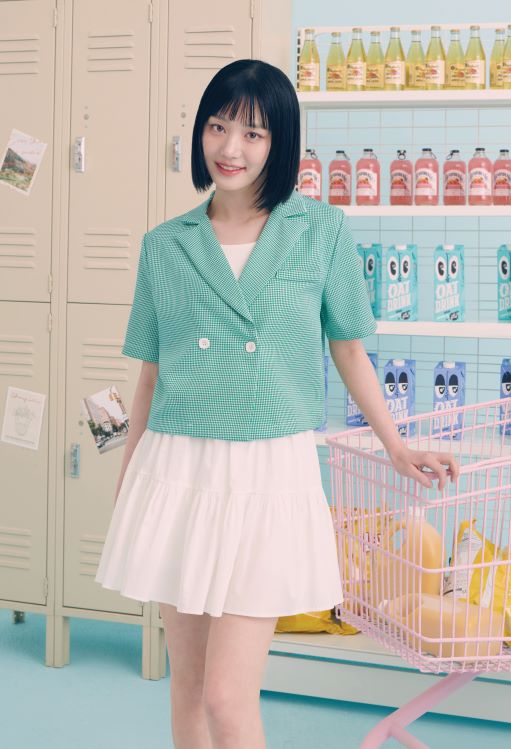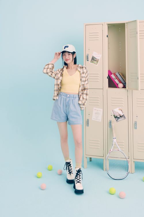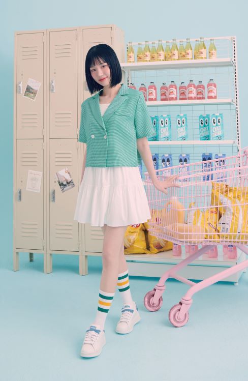 화보 속 이유비는 그린 컬러의 체크패턴 크롭 반팔 자켓과 화이트 이너 티셔츠와 화이트 플레어 미니 스커트 차림으로 테니스 웨어 느낌을 가미한 싱그러운 데일리 캐주얼 룩을 완성했다. 해당 자켓은 함께 코디하는 아이템에 따라 다양한 무드를 낼 수 있는 베이직한 디자인으로 활용도 높은 제품이다.