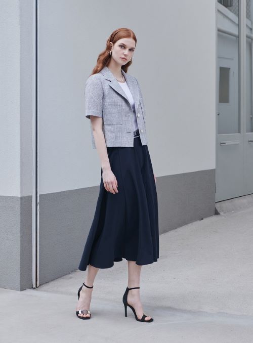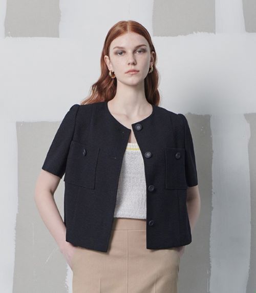 얇은 트위드 소재를 사용한 모던한 세미 크롭 기장의 ‘싱글 버튼 숏 자켓’은 가볍고 통기성이 뛰어나 한여름은 물론 간절기까지 착용하기 용이하고, 가슴 부분의 빅 포켓 디테일로 캐주얼한 무드를 선사함과 동시에 테일러드 칼라 디자인으로 포멀한 스타일링까지 가능하다.