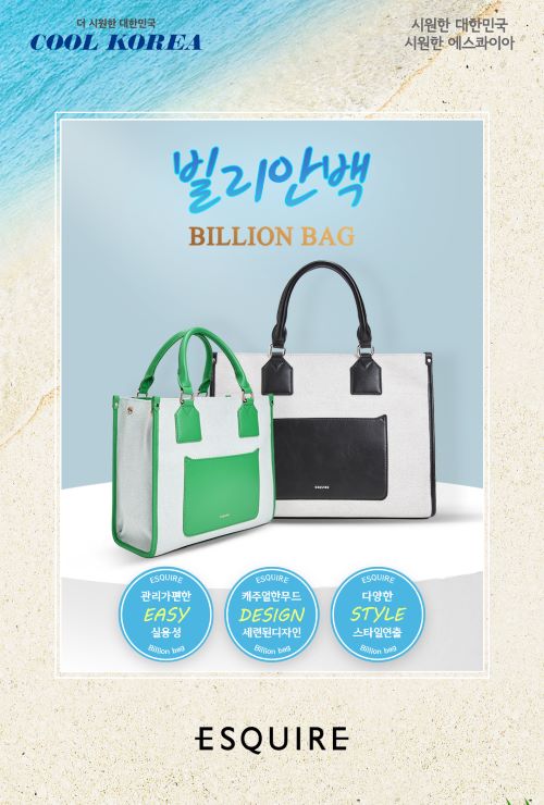 ‘에스콰이아 컬렉션’의 빌리안백은 내추럴한 매력의 투톤 컬러 캔버스 원단에 외부포켓과 핸들, 트리밍을 블랙, 브라운, 그린, 아이보리 컬러로 포인트를 주어 심플하면서도 트렌디한 디자인이 돋보이는 제품이다. 밝은 캔버스 원단과 대비되는 컬러 배색이 여름의 청량함과 잘 어울려 캐주얼하고 경쾌한 느낌을 준다.