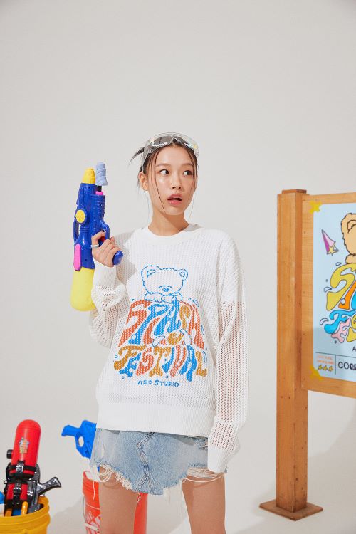 특히 ‘스플래시 페스티벌’ 그래픽은 유니크한 짜임과 경쾌한 색채의 니트 버전으로도 만날 수 있으며 브라톱이나 슬리브리스와 함께 레이어드해 페스티벌 룩으로 활용하기 좋다.