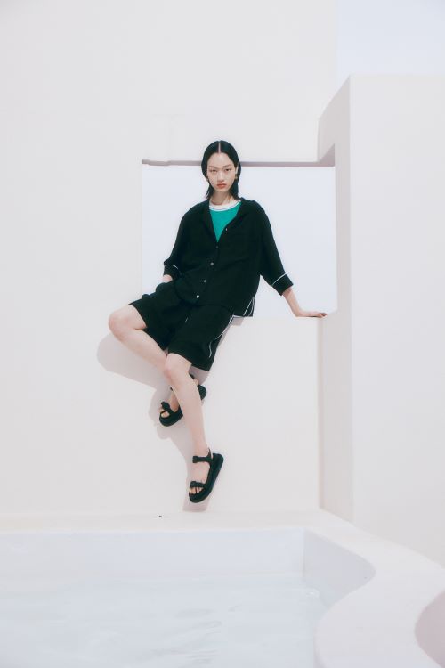 ‘구호’는 올해 리조트 컬렉션에서 경쾌한 배색 디테일을 더한 블랙 후드 재킷/쇼트 팬츠 셋업에 스포츠웨어로 많이 활용되는 테리 소재의 그린 민소매 티셔츠를 매치한 스타일링을 제안했다.