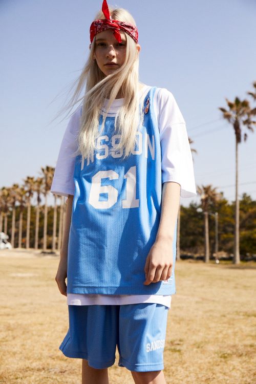 ‘샌드사운드’는 비치 농구 게임을 모티브로 한 여름 컬렉션에서 메시 소재의 농구 유니폼 슬리브리스/쇼츠 셋업 착장을 통해 자유분방한 휴양지 스타일링을 선보였다. 넘버링 패치가 들어간 오버사이즈 유니폼 티셔츠, 농구공 그래픽과 농구 게임 자수가 적용된 티셔츠 등 스포티한 무드의 아이템들을 함께 출시했다.