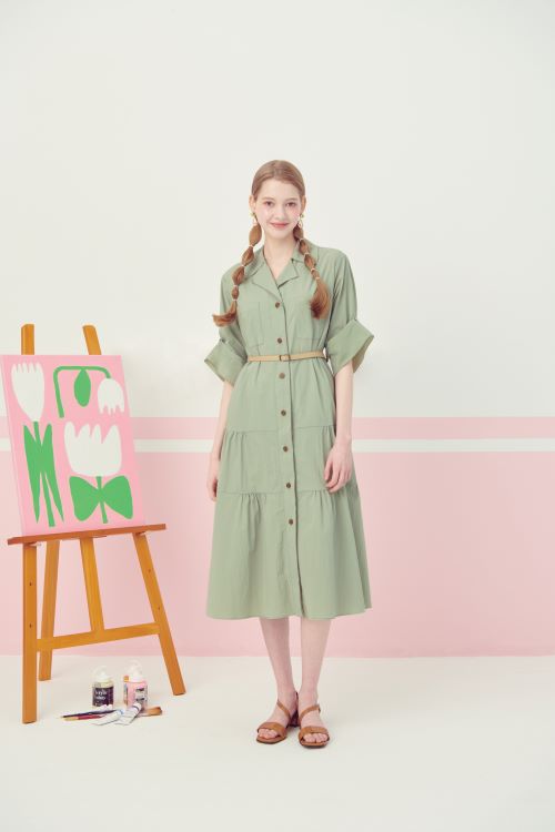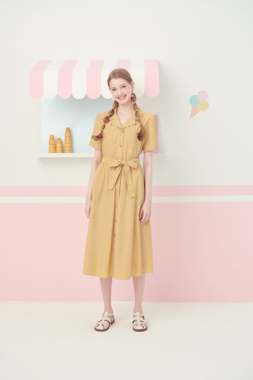 다음으로 롱한 기장감의 원피스 아이템 2종을 제안했다. 5부 롤업 소매 디자인의 카키 컬러 원피스는 제천 벨트와 레더 벨트가 포함되어 두 가지 벨티드 연출이 가능한 상품이다. 또한 톤 다운된 머스타드 컬러와 리본 장식의 원피스 역시 멋스러우면서 간편한 스타일로 올여름 클리지의 주력 제품으로 소개했다.
