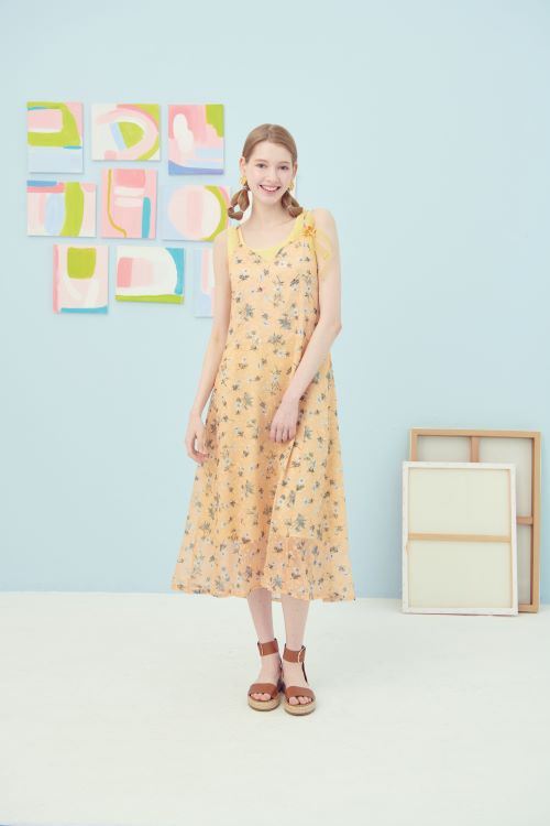 마지막으로는 산뜻한 컬러와 플라워 패턴이 돋보이는 쉬폰 원피스로 연출한 휴가룩. 뷔스티에 스타일로 슬리브리스 이너와 레이어드 해 핫썸머 시즌까지 다채롭게 활용할 수 있는 아이템을 제안했다.