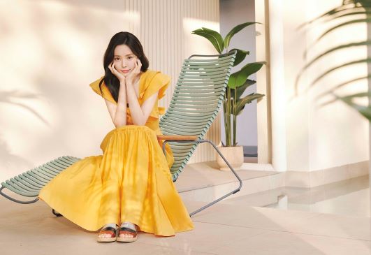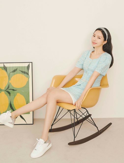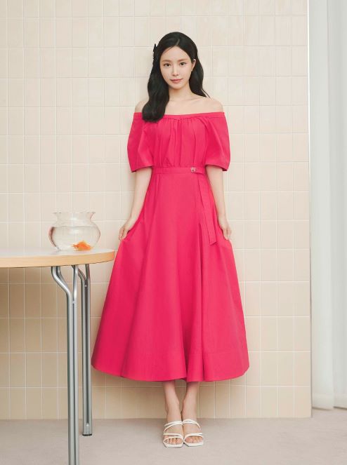 팝한 컬러감과 오프 숄더 디자인의 롱 플레어 원피스는 손나은의 사랑스러운 매력을 배가 시켰다.