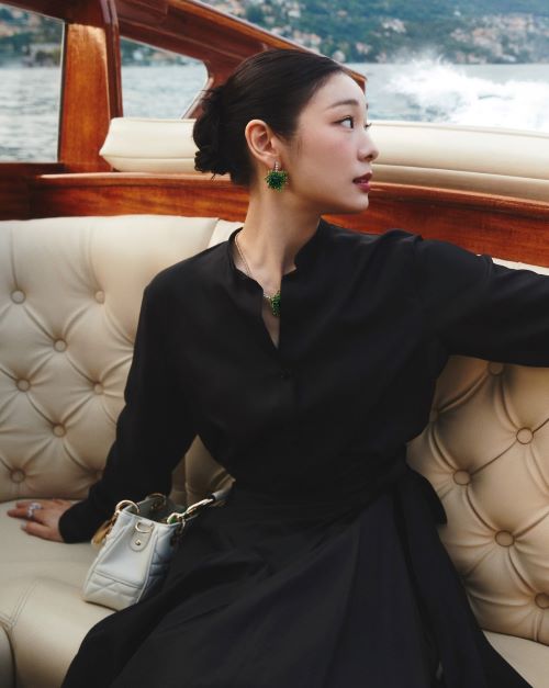 블랙 실크 드레스와 에메랄드가 돋보이는 DIOR ROSE 네크리스, 이어링을 착용해 눈부신 자태를 선보였다.