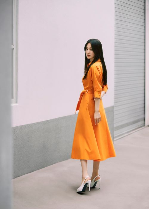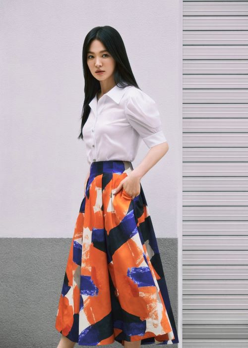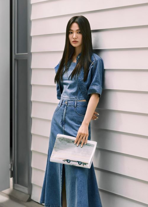 화보 속 송혜교는 배색 컬러가 돋보이는 셔츠 카라 형태의 A라인 원피스, 레글런 소매와 플레어 라인이 특징인 데님 셋업 등 다양한 아이템을 착용, 그녀만의 고급스러운 분위기로 재해석하며 23 PRE-FALL 컬렉션을 빛냈다.