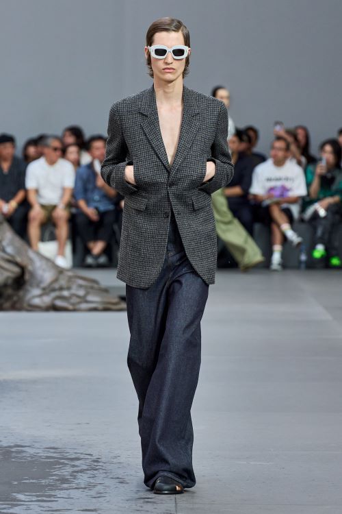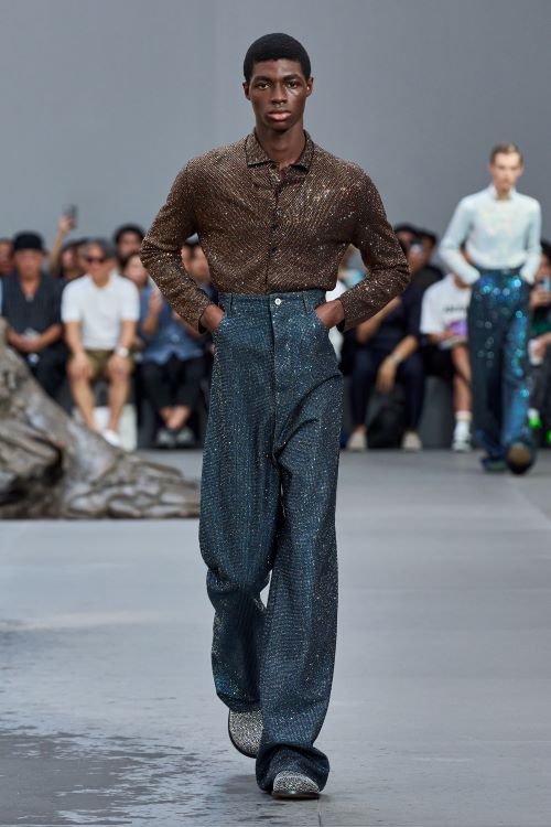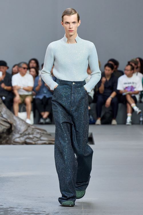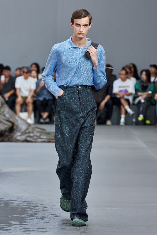 이러한 실험적 요소들은 블레이저와 코트, 뱅커 셔츠, 니트 폴로, 트윈 세트, 아가일 니트, 데님, 치노 팬츠 등 컬렉션 전반에 걸쳐 보여진다. 겉보기에는 자칫 단순해 보이지만 곳곳에 숨겨진 작은 디테일이 더해져 변형과 반전으로 가득하다. 마치 필터처럼 표면 전체를 크리스탈로 가득 채우거나 아주 촘촘한 스트라이프, 핀 스트라이프로 매력적인 셔츠를 만들어내는가 하면, 몸의 움직임을 반영한 재단 방식으로 매력적인 실루엣을 더하기도 했다. 마치 땅에서 솟아난 것만 같은트라우저와 슈즈가 결합된 피스 또한 매우 재미있다.