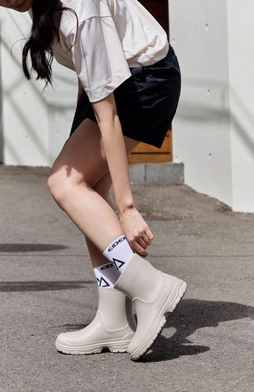 신발 바닥에는 러버를 추가하여 젖은 노면에서도 미끄러 지지 않고 안전한 보행이 가능하도록 디자인했다. 실제 ‘아이더’ 연구소의 신발 아웃솔 미끄럼저항성 시험 결과 쉽게 미끄러질 수 있는 습식 환경의 대리석타일면에서 마찰계수가 기준치(고용노동부 산업안전보호구 인증 고시 기준 0.36초과) 보다 높은 0.75를 기록하며 우수한 미끄럼저항성을 나타냈다. ‘아이더’만의 기술력을 담아 등산화 못지 않은 미끄럼저항성을 경험할 수 있는 레인부츠로 네이비와 베이지 두 가지 색상으로 만나볼 수 있다.