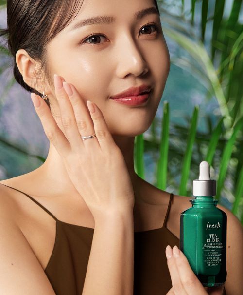제품을 손에 들고 바르는 듯한 화보에서는 자연스러우면서도 탄력 넘치는 피부와 고급스러운 광이 조이의 미소와 어우러져 여신미를 자아낸다.