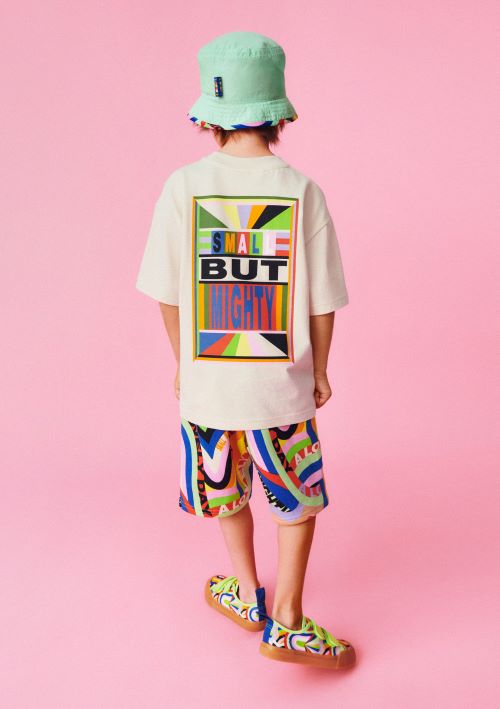 낙천적인 분위기가 스타일링 전반에 반영되어 자기표현을 강조하고 있으며 프린트된 슬로건에 표현된 사랑과 우정이라는 가치를 어린이 영웅들에게 전하고 있다. ‘Small but mighty’, ‘A lovely day’ 등의 문구가 티셔츠나 후디 등에 반복적으로 사용되었는데 무지개색의 곡선과 소용돌이 등의 패턴과 함께 쓰이거나 문구 자체가 하나의 그래픽처럼 보이도록 디자인되었다.