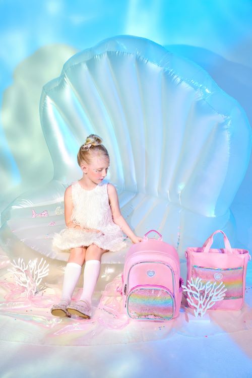 메인 제품인 루첸테 스쿨백은 가방 전면부 무지개빛 글리터 원단과 스팽클 파츠 포켓 등의 블링블링한 디자인 포인트는 물론 핑크, 라벤더 등의 파스텔 톤의 컬러감으로 러블리한 무드를 한껏 더한 것이 특징이다.