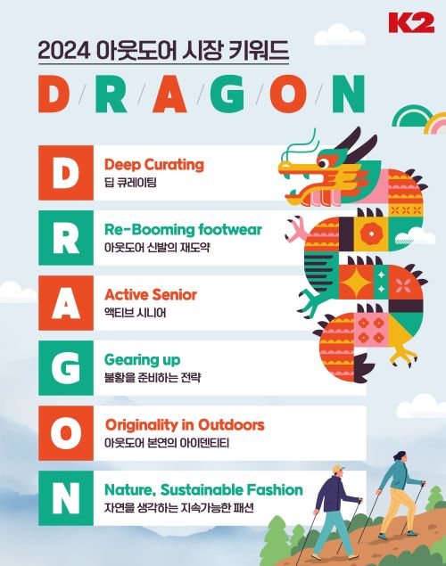 ‘K2’가 2024년 아웃도어 시장을 전망하는 키워드로 드래곤(D.R.A.G.O.N)을 선정했다.