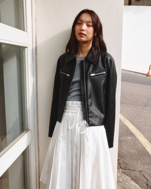 ‘구호플러스’는 이번 시즌 대표 착장으로 슬리브리스가 레이어드된 시어 소재의 니트 탑, 화이트 컬러의 미디 플리츠 스커트에 페이크 레더 재킷을 매칭해 시크함과 여성스러움이 공존하는 레이어링룩을 제안했다.