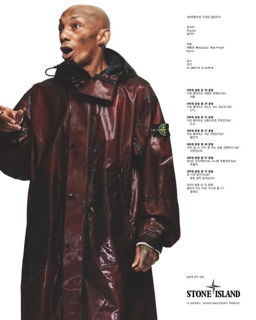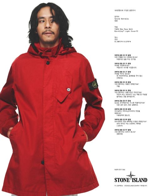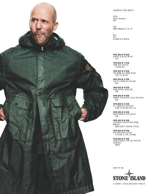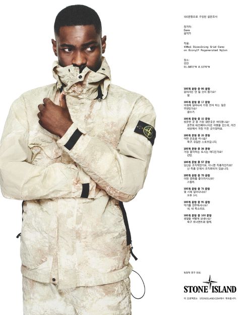 이번 캠페인은 배우 제이슨 스타뎀, 프로듀서 겸 뮤지션 데이브, 안무가 웨인 맥그리거, 테니스 선수 헨리 설, 래퍼 트리키, 건축가 하이덜프 게른그로스 등 ‘스톤 아일랜드’의 글로벌 커뮤니티 구성원 16명이 참여 하였다. 각 참가자를 위한 특별한 10가지 질문과 이미지와 함께 게재되어 특별하면서도 풍성함이 보여진다.