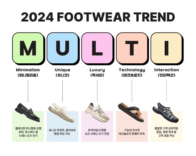 다변화되는 고객 니즈에 따라 기능성과 패션 두 가지 요소를 멀티로 충족시키며 일상과 취미생활, 비즈니스 등 라이프스타일 전반의 경계를 넘나드는 브랜드와 제품이 떠오를 것이라는 전망과 함께 다채로운 콜라보 등 변화무쌍한 풋웨어 시장의 트렌드 예측을 담은 키워드다. ‘MULTI’는 미니멀리즘(Minimalism), 유니크(Unique), 럭셔리(Luxury), 테크놀로지(Technology), 상호작용(Interaction)을 뜻하는 영어 단어의 앞 글자에서 따왔다.