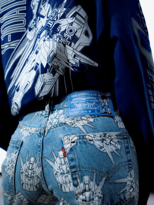 이번 컬렉션에서는 ‘Levi's x Gundam’ SEED 93 501 청바지와 그에 어울리는 릴렉스 트러커가 주목받고 있으며 인디고 데님 소재에 라이트 스톤 워시 마감 처리가 된 청바지와 재킷에는 전체적인 스트라이크 건담 패턴 프린트와 블루 콜라보레이션 백패치가 특징이다.