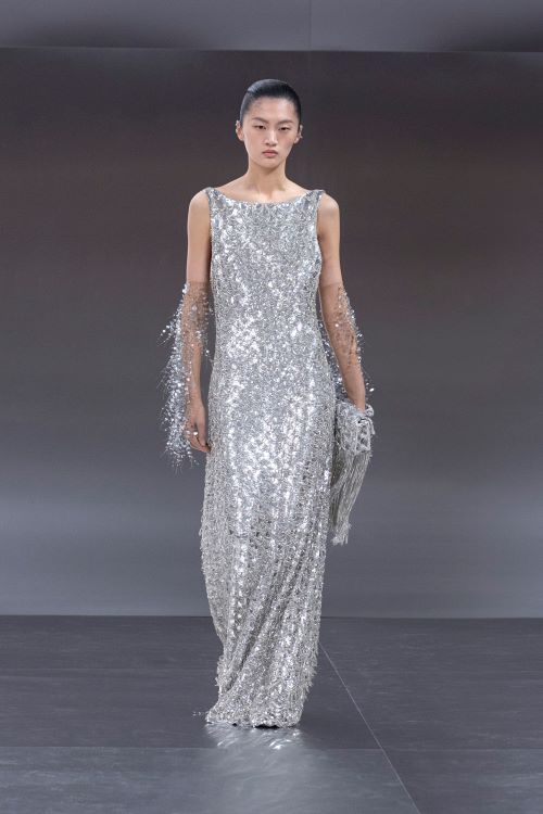그러나 마치 미래의 아름다움을 눈앞에 마주한 듯한 감각을 환기하는 것은 그중에서도 강도 높은 작업을 거쳐 완성된 수많은 자수, 그 장식과 구조의 어우러짐일 것이다. 가장 놀라운 점은 바로 자수에서 자연 세계와 인위적인 세계의 DNA가 서로 연결되기도 하고 분리되기도 한다는 점이다. 예를 들어 깃털 같은 형상으로 완성된 새로운 형태의 올 오버 프린지는 색다른 종류의 펠트 소재처럼 느껴진다. 수작업으로 탄생한 정교하면서도 섬세한 자수는 유기적인 형태, 가벼움, 그리고 물결이 흐르는 듯한 우아함을 만들어내 착용자의 몸짓에 따라 유려하게 움직인다.