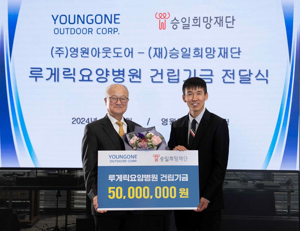 영원아웃도어(대표 성기학)가 승일희망재단(대표 박승일, 션)에 기부금 5천만원을 전달했다.