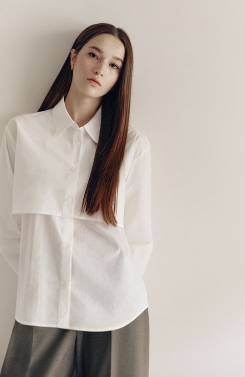 스커트 앞 부분은 포인트 단추와 절개 디테일을 더해 디자인 완성도를 높혔다. 팬츠와 함께 코디한 화이트 레이어드 셔츠는 베이직한 핏이지만 레이어드할 수 있게 디자인하여 실용적이고 트렌디한 느낌을 준다.