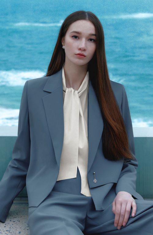 모델이 착용한 정장 셋업은 ‘나이스클랍’의 스테디셀러 셋업을 변주하여 제안한다. 컷팅된 듯한 앞판 디테일과 팬던트 디테일 포인트로 세련되게 연출 가능하고 함께 코디한 블라우스는 타이를 자연스럽게 묶어 시크하게 스타일링했다.