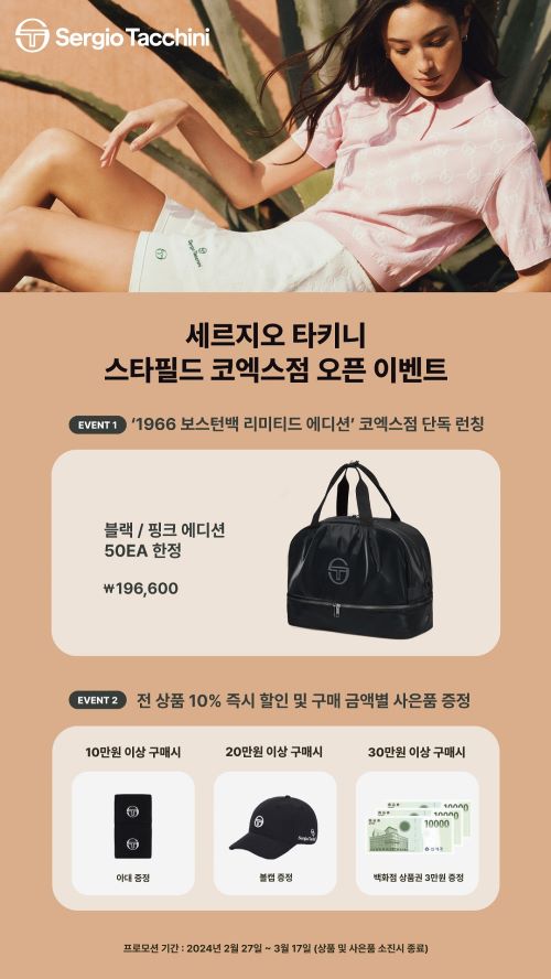 한편 ‘세르지오 타키니’ 스타필드 코엑스점은 모던하고 럭셔리한 스포티브 컨셉의 인테리어로 기존 스포츠 매장과 차별화된 무드를 선보인다. 스테디셀러 아이템인 플리츠 스커트존과 애슬레저룩존, 라이프스타일존 등 섹션을 다채롭게 구성해 고객의 니즈에 맞춘 상품군을 한 자리에서 만나볼 수 있다.