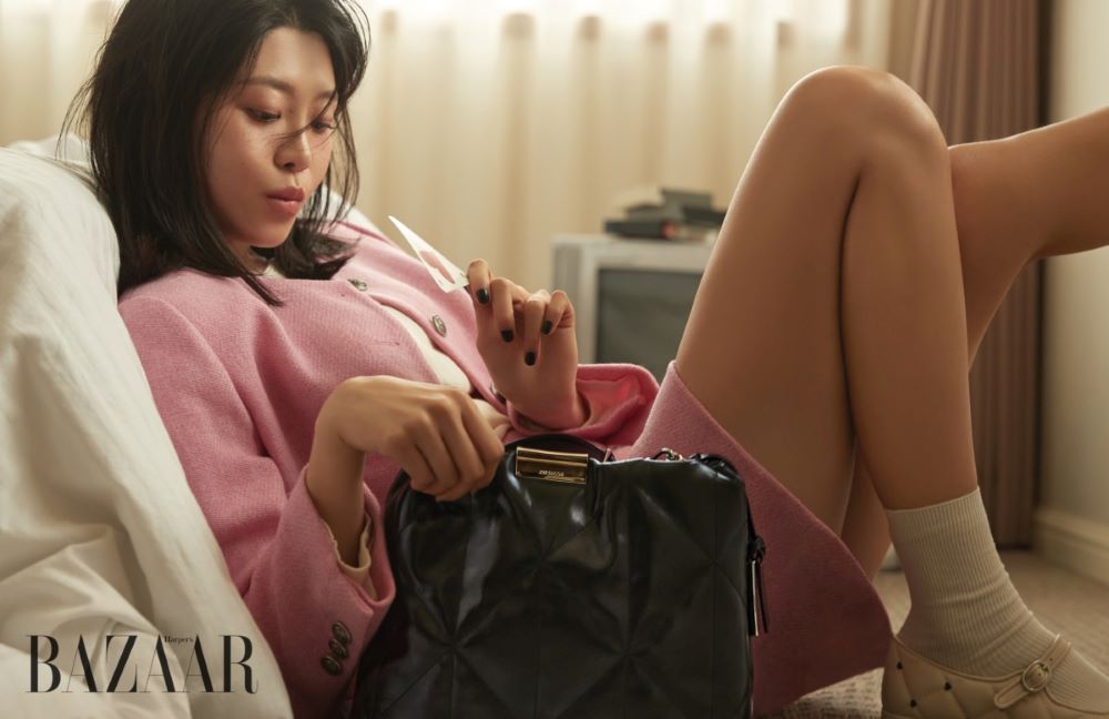 이번 화보에서 최혜선은 상큼한 비주얼과 더불어 반전 매력이 돋보이는 아련한 눈빛을 선보이며 로맨틱한 무드의 화보를 완성했다. 화사한 핑크 컬러의 트위드 셋업에는 볼륨감 있는 패턴의 글램 숄더백을 매치해 올 봄 데이트 코디로 참고 하기 좋은 룩을 연출했다.