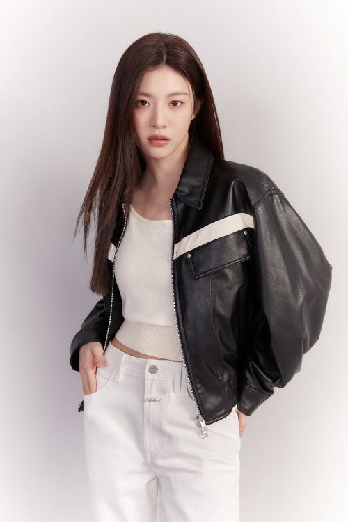 고윤정은 그녀의 매력 포인트 중 하나로 꼽히는 긴 생머리를 늘어 트리고 블랙 컬러의 비건 레더 재킷과 화이트 팬츠로 존재감 넘치는 룩을 연출했다.