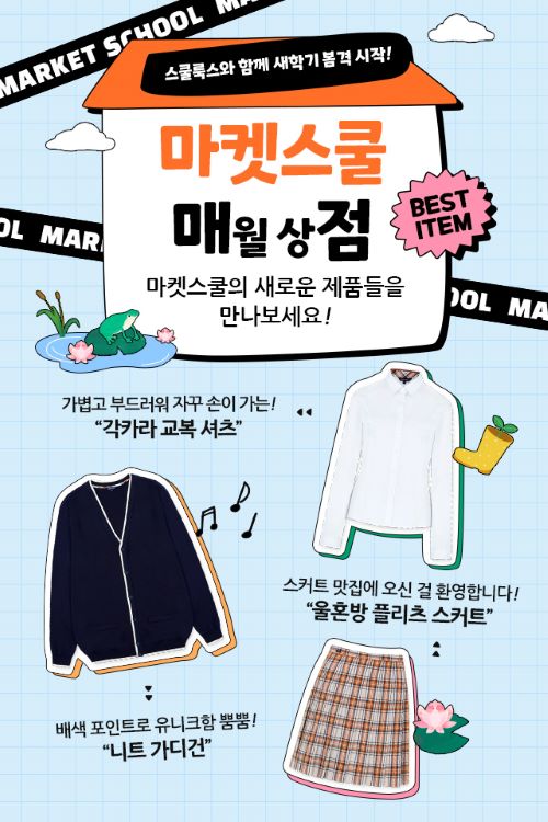스쿨룩스는 자사 공식 온라인몰인 마켓스쿨의 매월상점을 통해 학생들의 스쿨 라이프를 더욱 즐겁고 멋있게 만들어 줄 시즌 아이템을 추천하고 있다. 3월 매월상점에는 신학기를 맞아 고급스러우면서도 실용적인 디자인의 신학기룩을 선보인다.