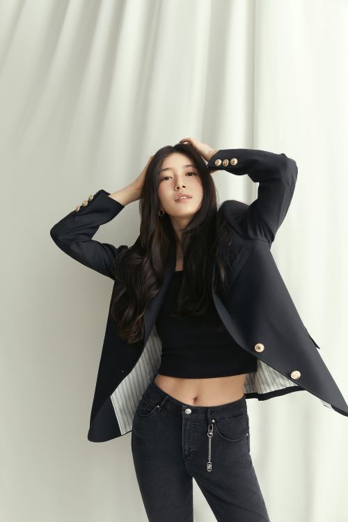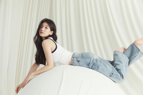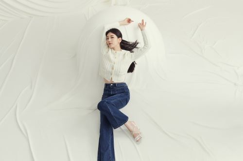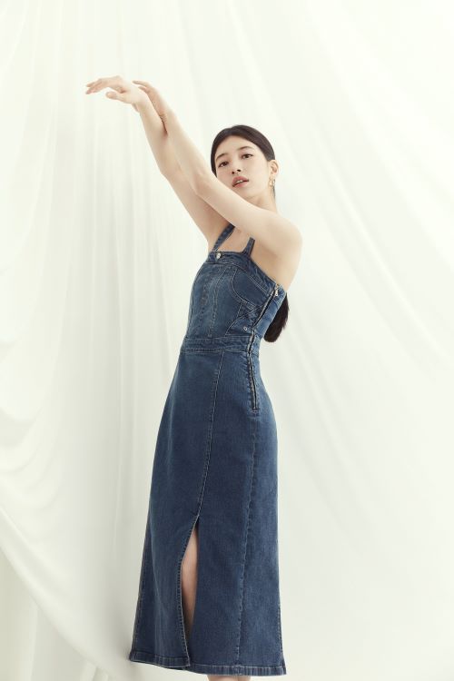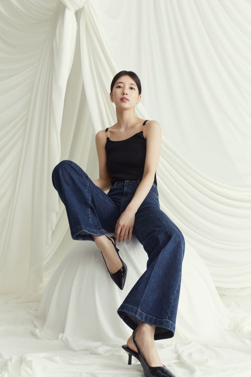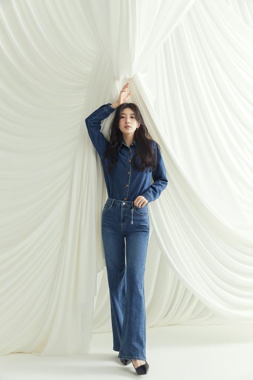 블랙 라벨 컬렉션은 고급스러운 소재와 군더더기 없이 깔끔하게 허리 라인을 잡아주는 클린 스티치 디테일, 다리를 길어 보이게 해주는 게스 특유의 패턴 기술이 모두 집약된 프리미엄 데님 팬츠 컬렉션으로 화보 속 수지의 몸매 라인을 더욱 돋보이게 만들어 주고 있다.