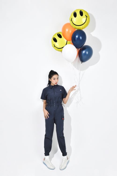 보라는 이번 화보에서 ‘더블플래그’의 이번 시즌 시그니처 아이템인 반전 듀얼레터 그래픽 와이드 팬츠와 스마일O 그래픽 점프수트를 착용했다.