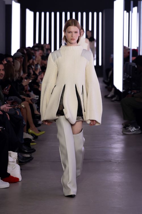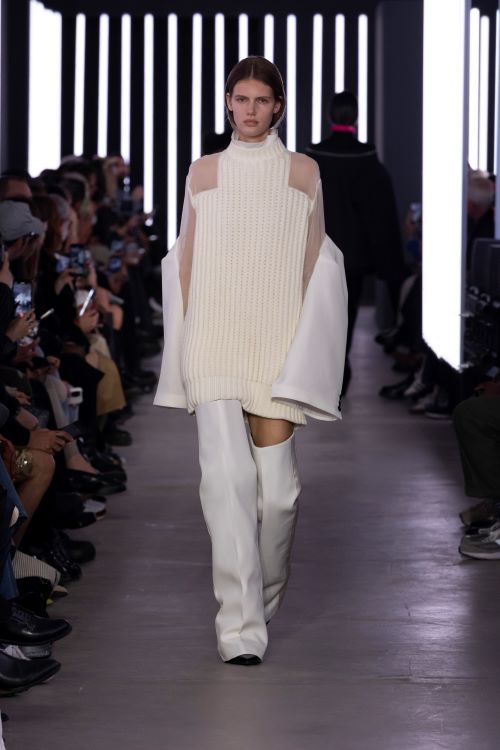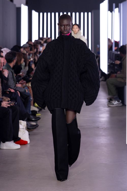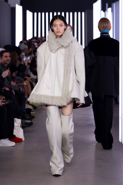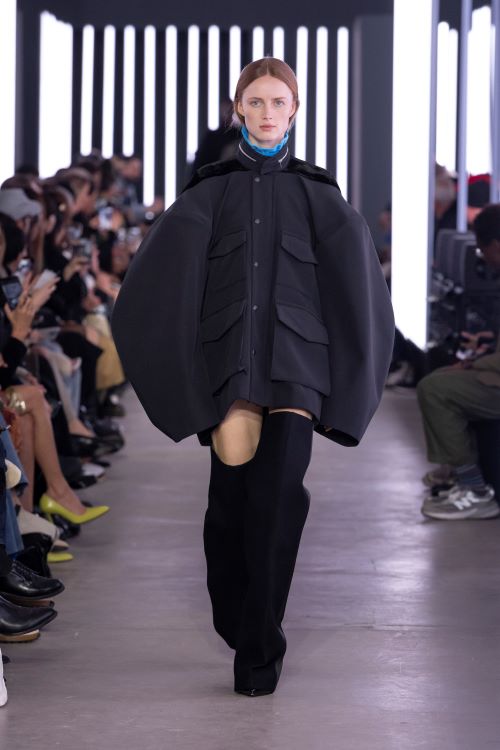 이러한 개념은 정면에서 보았을 때 바지로 보이는 롱 부츠까지 연장되었다. 실루엣은 재정의되고 완벽해져 모든 앵글에서 놀라운데, 정면의 플라이트 자켓 + 볼륨 있는 수트 자켓의 소매 + 후면의 퀼팅의 조합으로 봄버 자켓을 페플럼 자켓으로 융합시켰다.