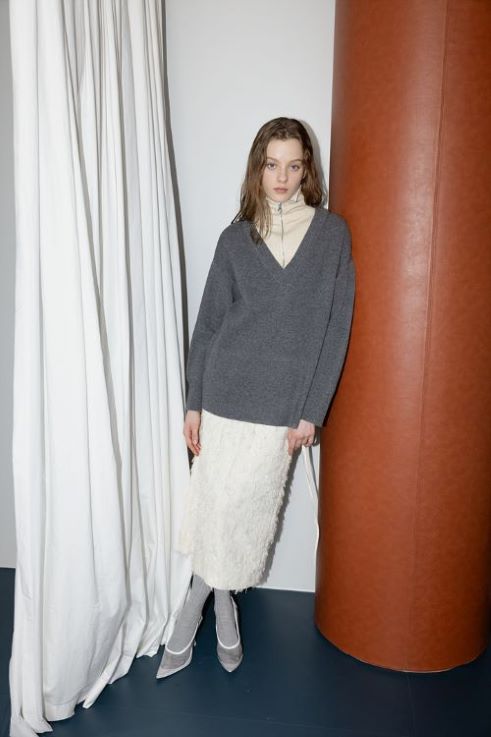‘구호플러스’는 그레이/블랙 상하의 조합에 볼륨감이 느껴지는 아이보리 트렌치코트를 매칭, 차분한 매력을 더했다.